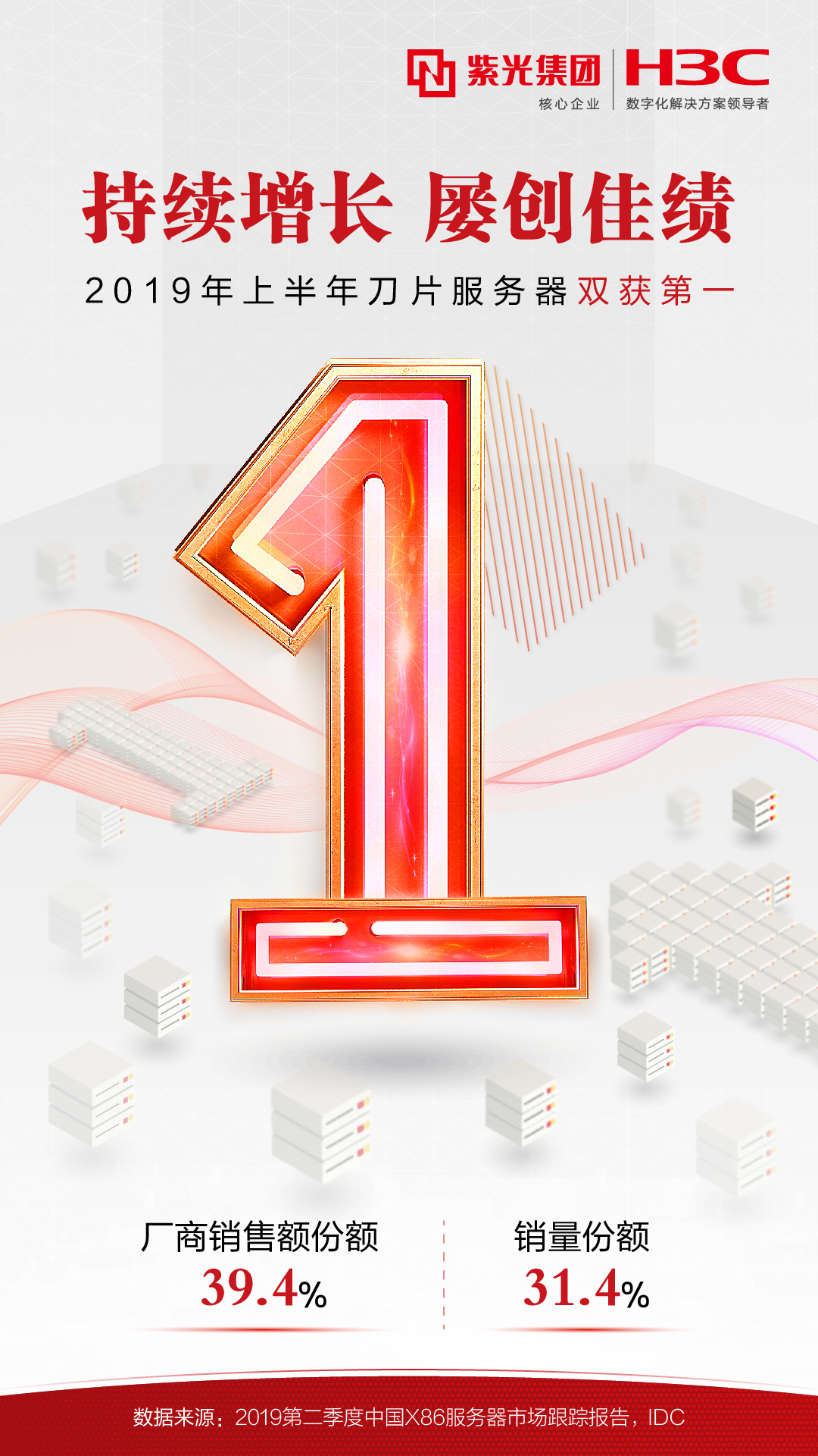 近日,全球權威市場(chǎng)研究機構IDC公布了2019年第二季度中國x86服務器(qì)市場(chǎng)跟蹤報告,紫光旗下新華三集團服務器(qì)業務再創佳績,其中刀片服務器(qì)深得(de)市場(chǎng)青睐,取得(de)2019年第二季度與上(shàng)半年銷售量和(hé)銷售額雙項第一的優異成績,上(shàng)半年刀片服務器(qì)銷售量占比31.4%、廠商銷售額占比39.4%,銷售額更是超過市場(chǎng)排名第二、三名廠商的總和(hé)。
